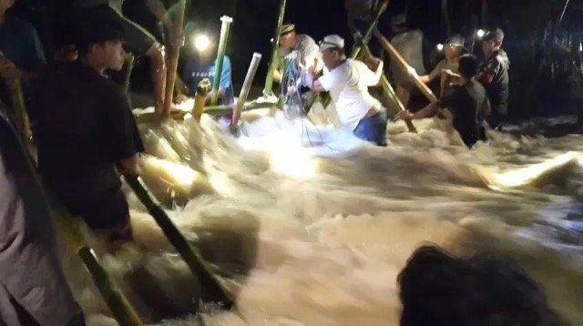 “Warga gotong royong bikin tanggul darurat pakai karung dan bambu, sebisanya saja,” kata Satibi.