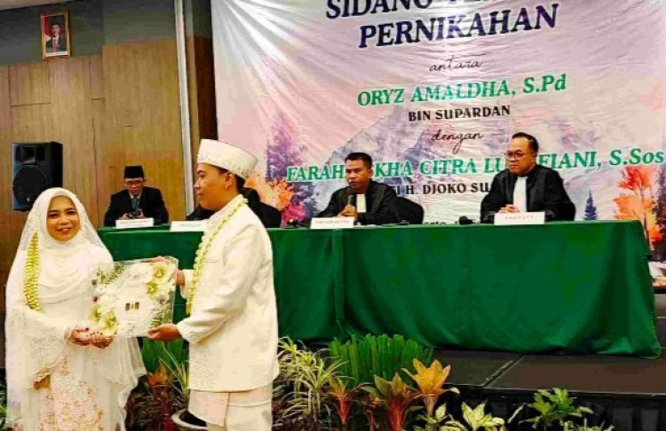 Suasana berbeda tampak dalam sebuah resepsi pernikahan yang digelar di Purwokerto, Banyumas. Alih-alih menghadirkan dekorasi adat atau nuansa elegan khas pesta pernikahan, para tamu justru disambut dengan tata ruang menyerupai persidangan terbuka.