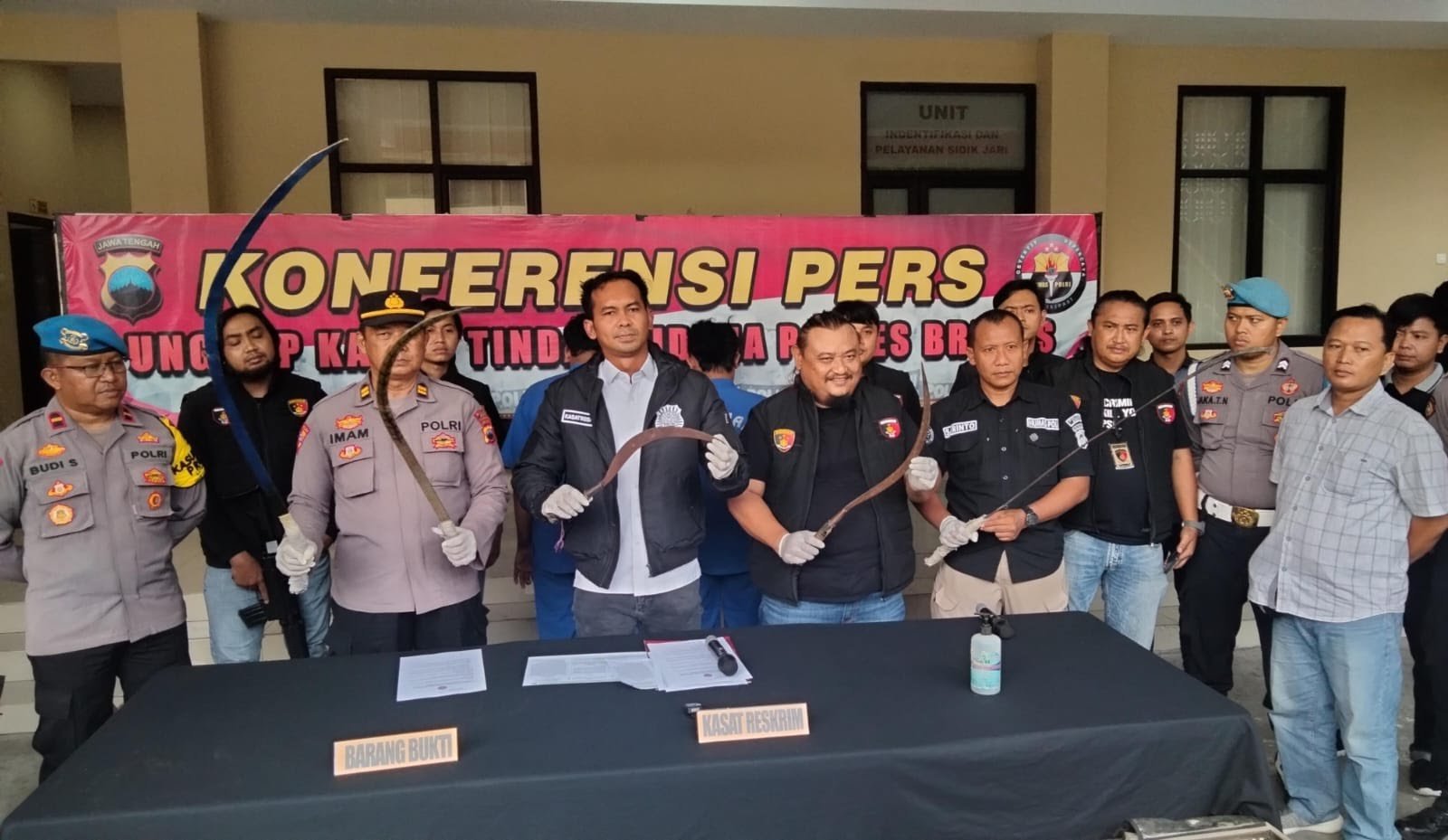 Pada saat penangkapan, polisi turut menyita sejumlah barang bukti sebuah jaket warna hitam, satu unit sepeda motor Vario hitam, satu sepeda motor Beat hitam, dan empat senjata tajam jenis clurit panjang.