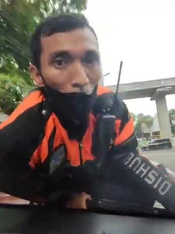 Beberapa petugas kemudian memalang pengendara tersebut, menggedor-gedor kendaraannya, hingga akhirnya satu petugas melompat dan nekat nemplok di kap mobil.