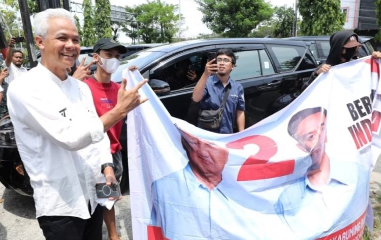 Melihat hal itu, Ganjar langsung menghampiri para pendukung Prabowo. Saat didatangi, dua orang laki-laki itu terlihat malu dan menutup spanduk, dan dicegah oleh Ganjar.