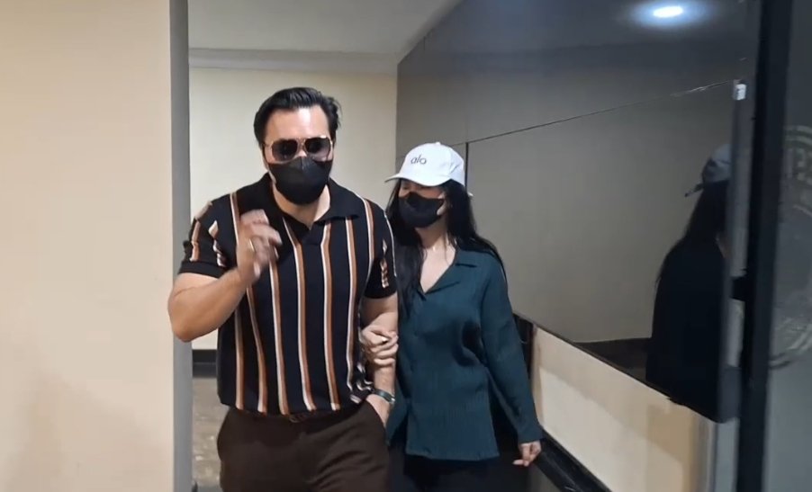 David Bayu tampak memakai kacamata dan masker hitam. Sedangkan, Audrey Davis memakai topi dan masker. Foto: Disway