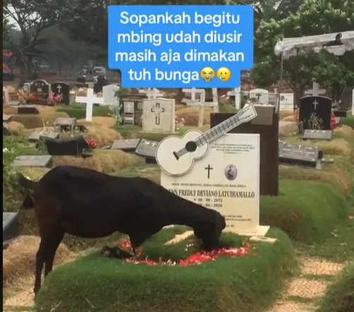 Namun yang jadi perhatian warganet adalah, posisi kaki depan kambing tersebut terlihat berlutut. Hal itu seolah menandakan si kambing memang tidak mau menginjak makam ketika sedang makan bunga.